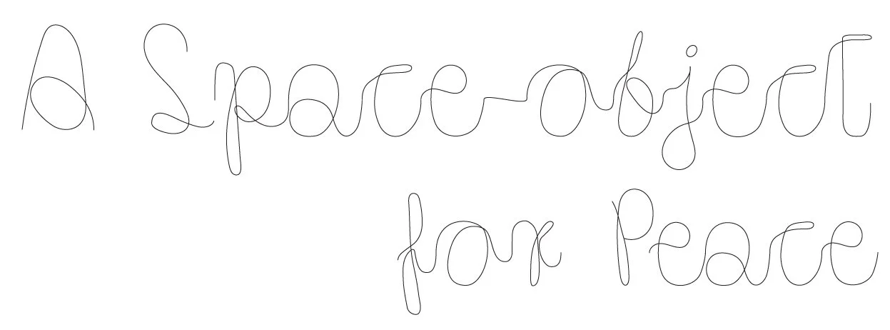Image Description: The words "A Space-object for Peace" are formed with an organic typeface in which each letter connects to the next, like a long, looping thread . Typography designed by Lorena Zapiain Porras.