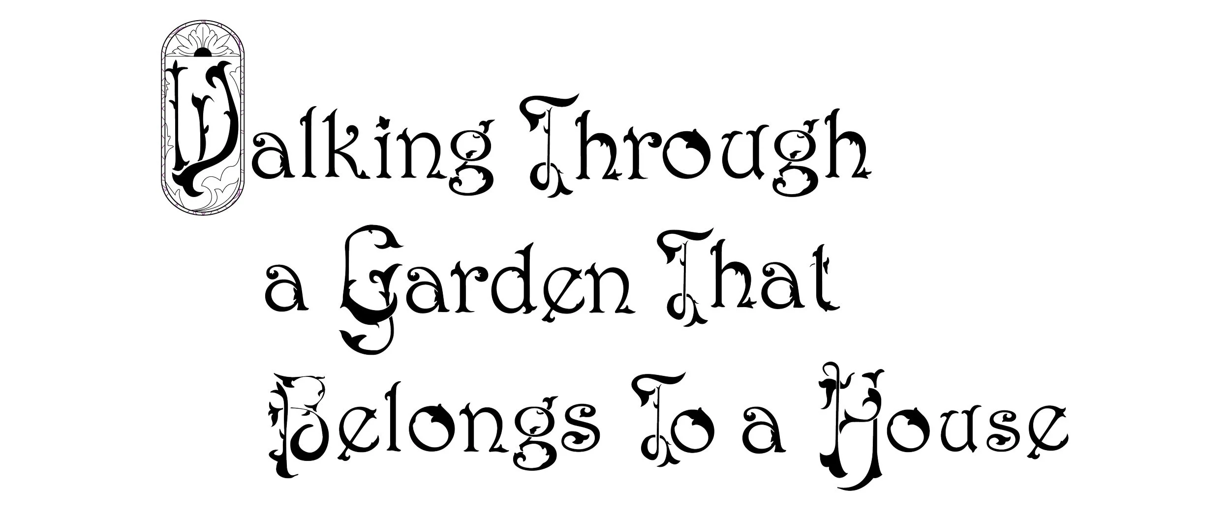 Image Description: An ornamental typeface Calantha shapes the words ‘Walking Through a Garden That Belongs To a House.’. The decorative flourishes of the letterforms recall the ornamentation on door handles at Villa Alba Museum. Typography designed by Jai Mudgerikar.